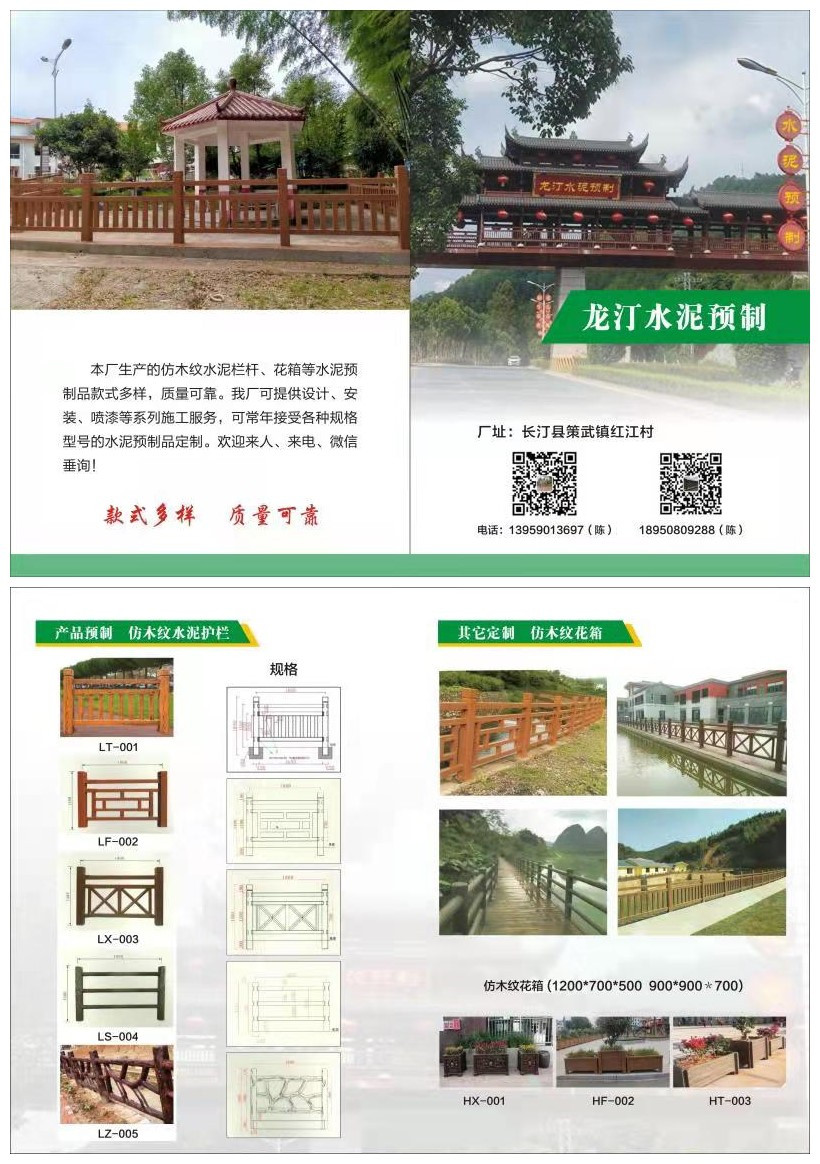 长汀县龙汀商贸有限公司,我们主要生产仿木纹水泥栏杆、花箱等水泥预制品等,款式多样,质量可靠。我厂还提供设计、安装、喷漆等系列施工服务,可常年接受各种规格型号的水泥预制品定制。欢迎广大客户来人、来电、微信垂询!服务热线:13959013697!